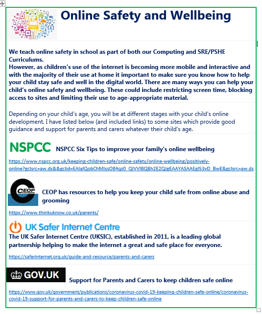 This page aims to give guidance to parents looking for information on how to support their child with their online safety and wellbeing.