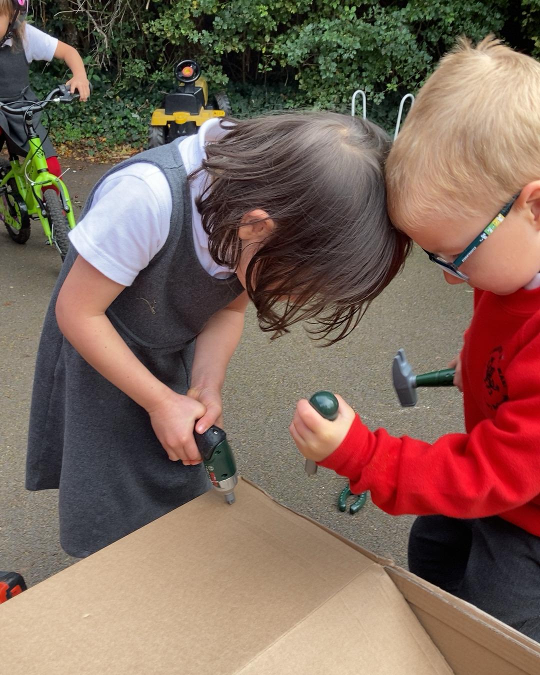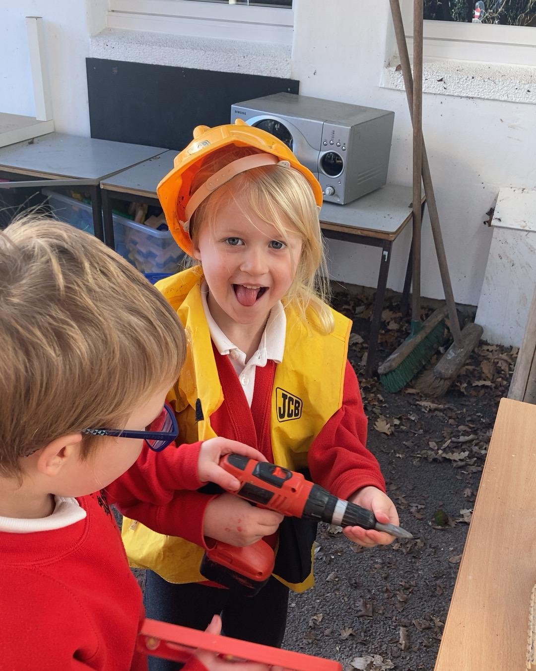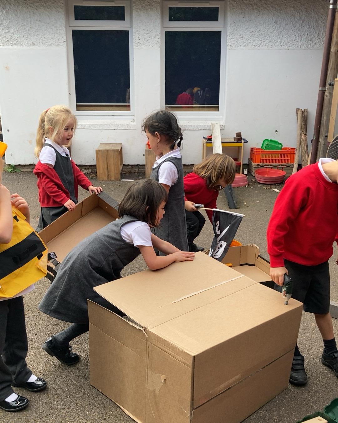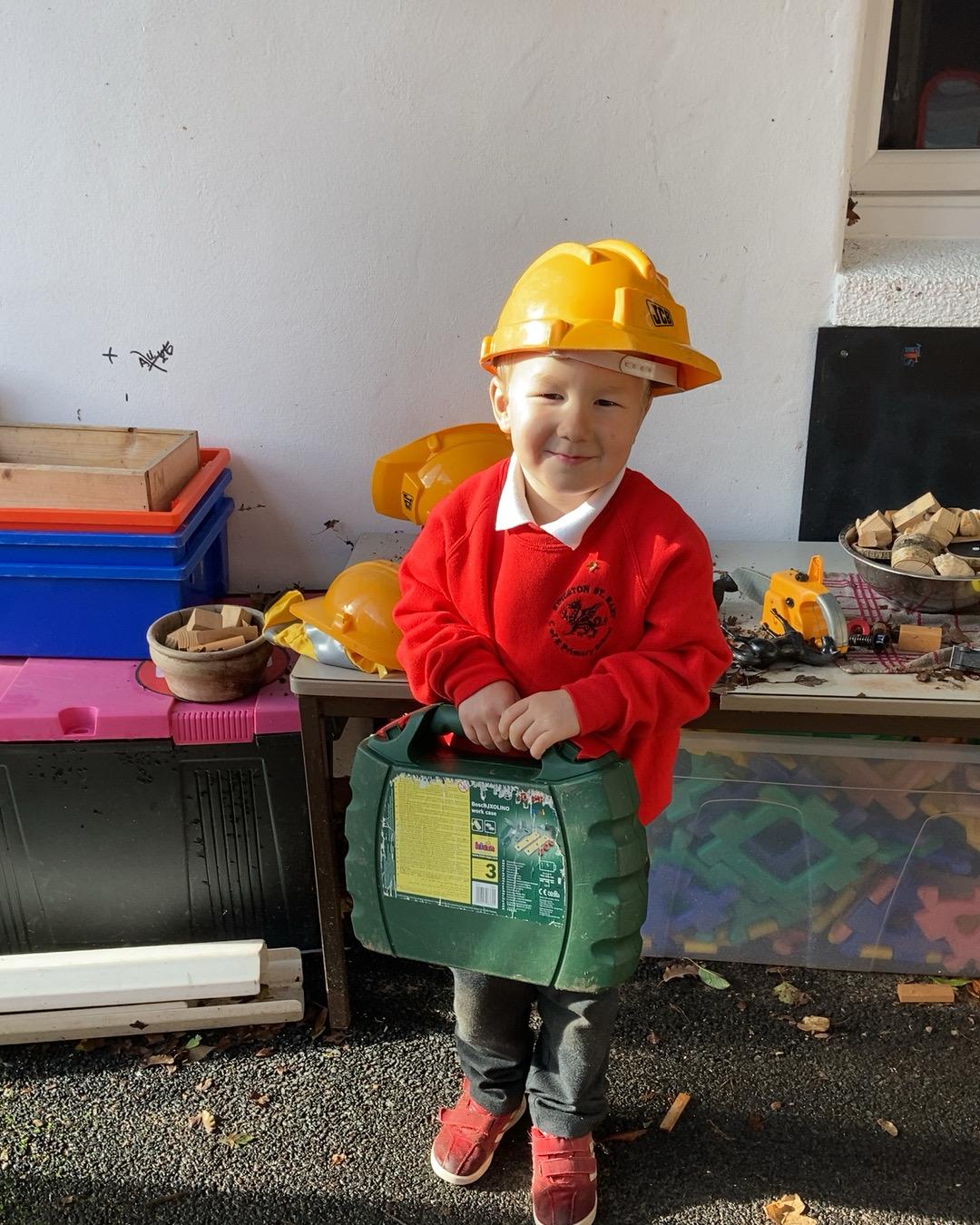 October 2022. We all love playing with boxes and today we role-played a construction site. We used the tools to build a house. We talked about health and safety and why it's important to wear a hard hat.