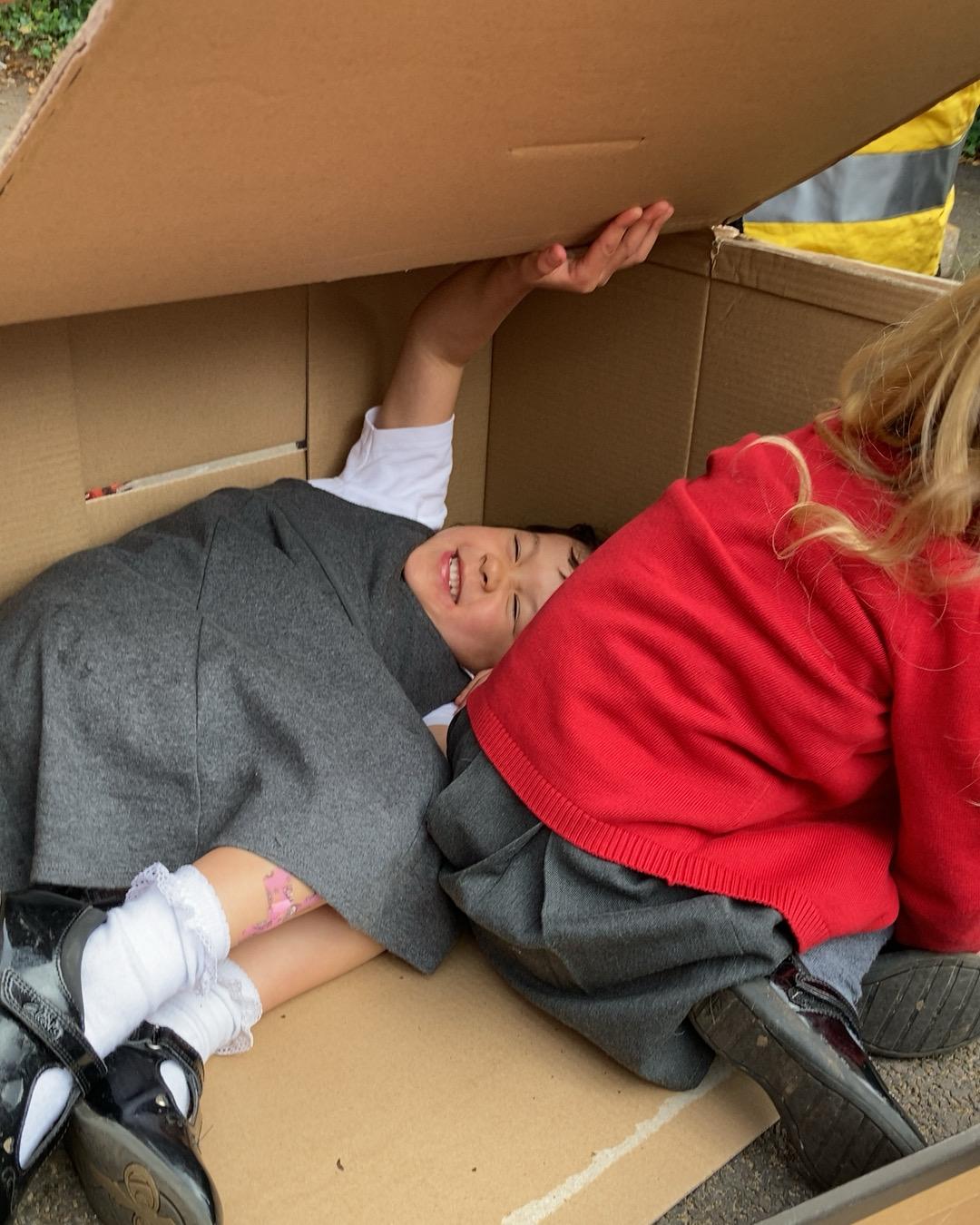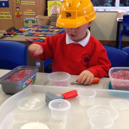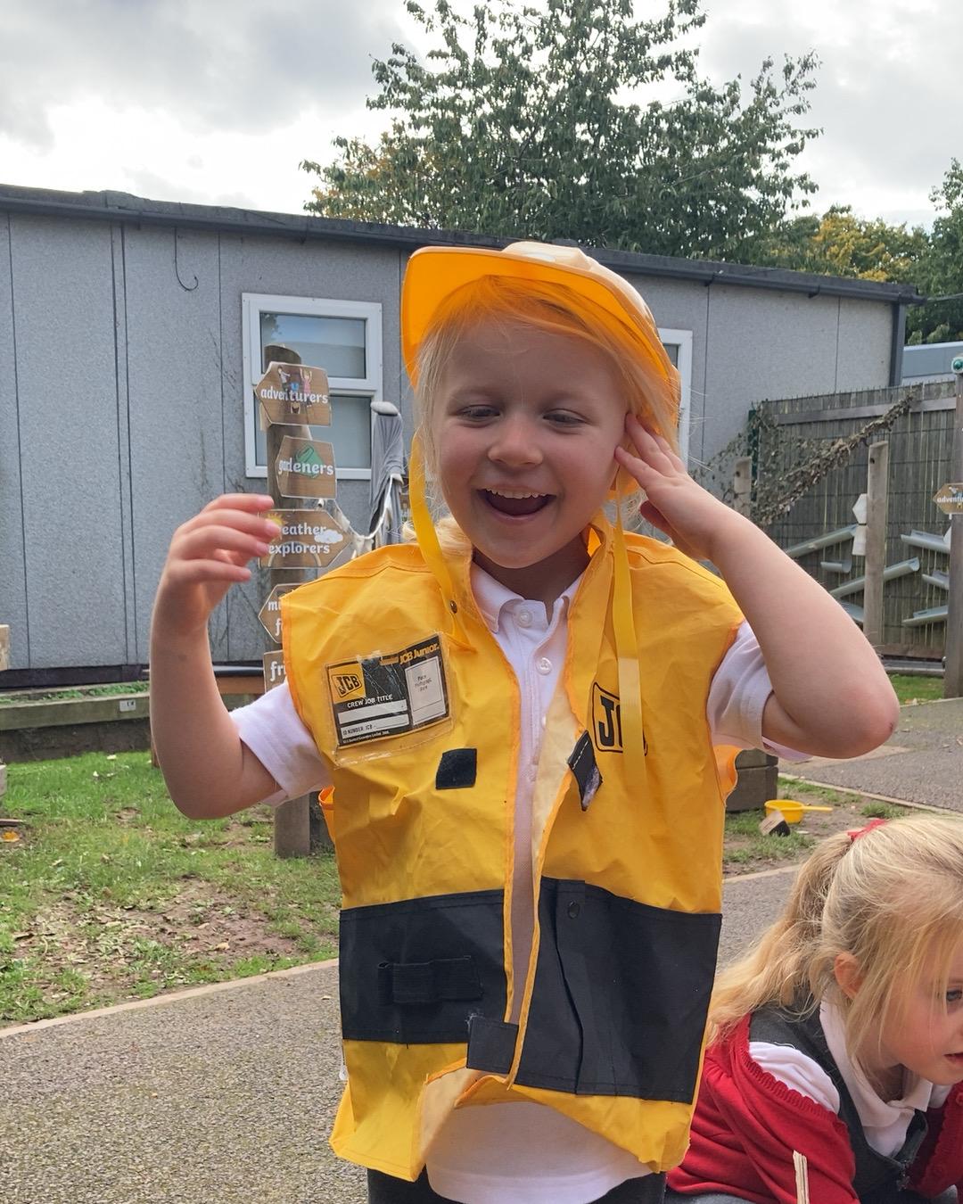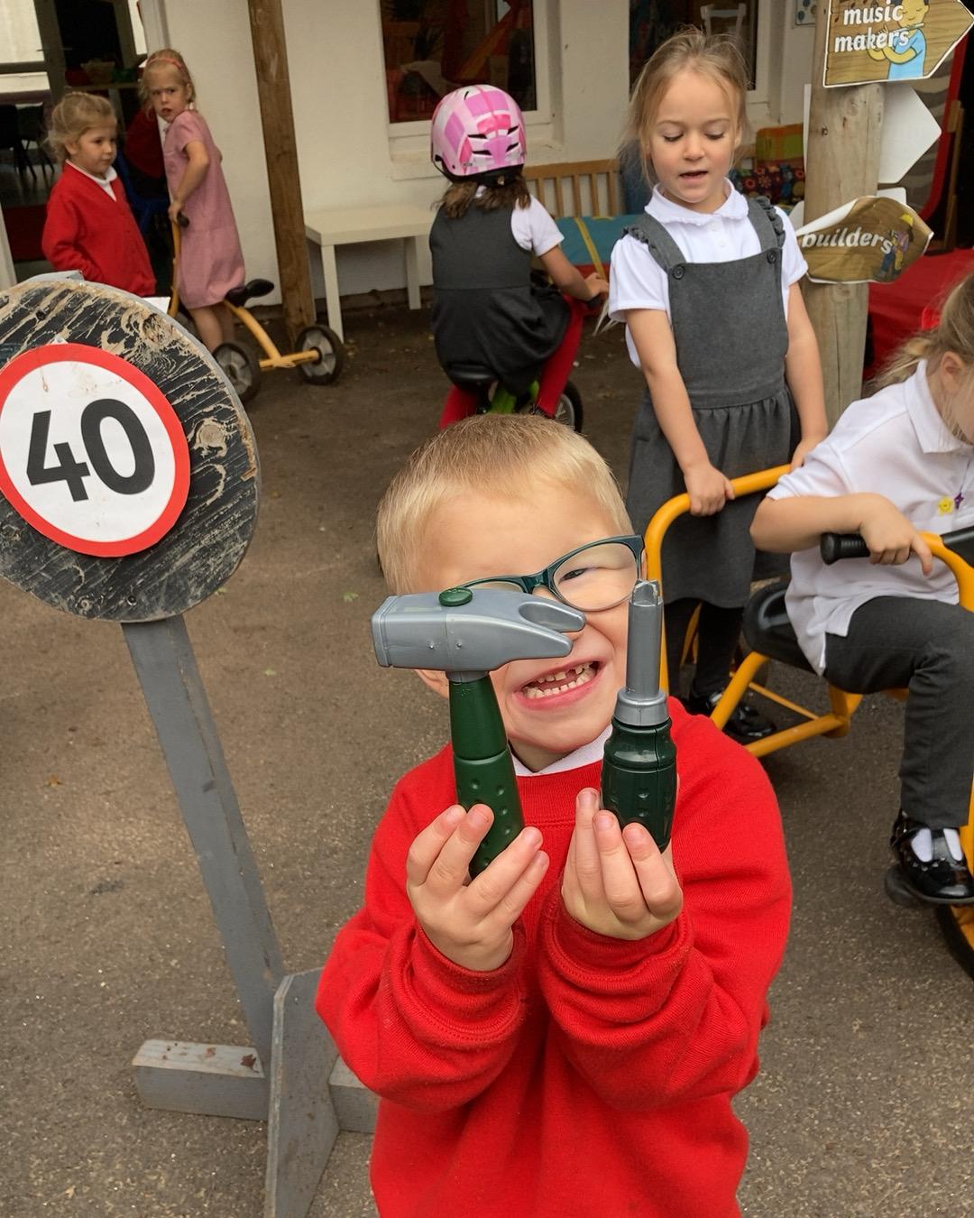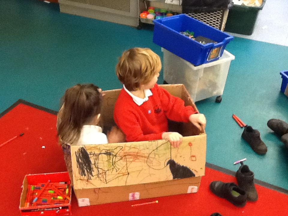 October 2022. We all love playing with boxes and today we role-played a construction site. We used the tools to build a house. We talked about health and safety and why it's important to wear a hard hat.