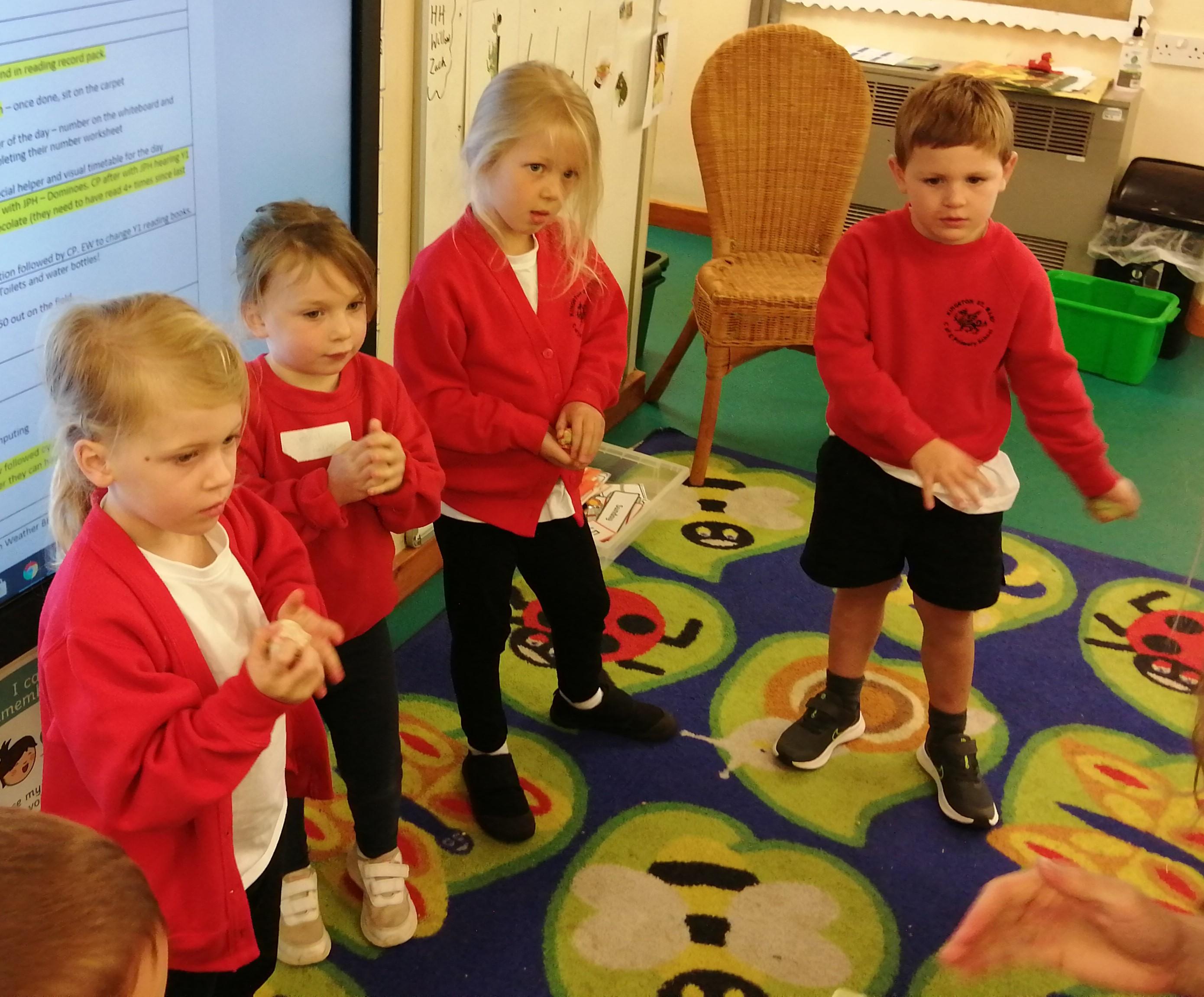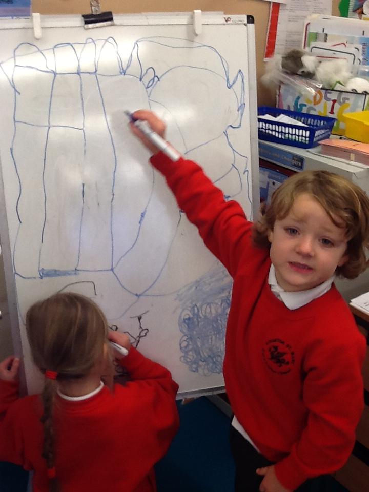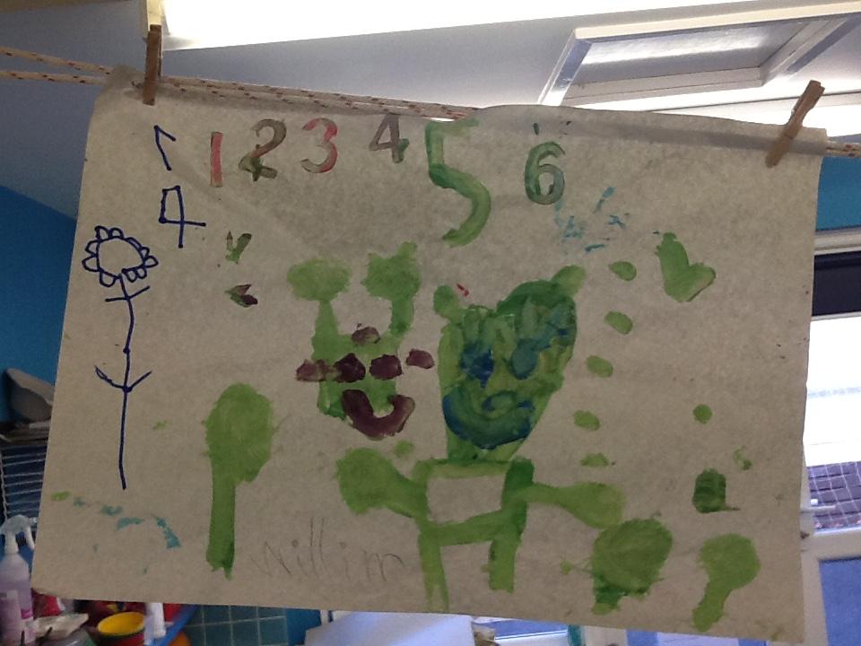 In maths we looked at positional language and described where teddy was. We also started looking at number 4 in greater detail. Learning how to write it and finding different ways to make number four. The children were able to tell me 2+2 = 4, 2+1+1=4 and so does 3+1.