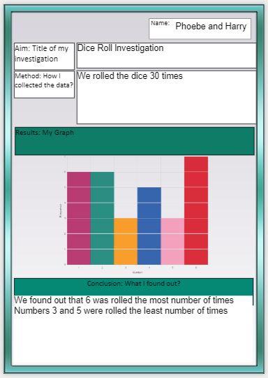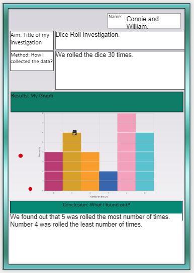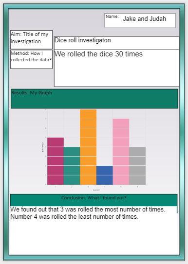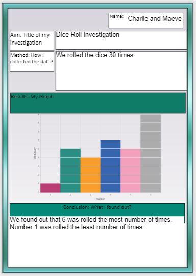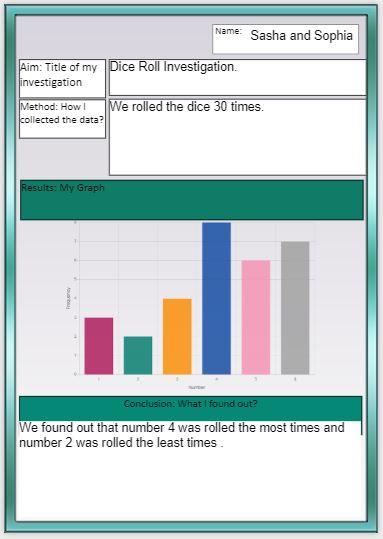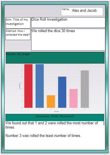 We rolled a dice thirty times & kept a tally chart. Then, we entered that information onto the computer to create a graph.